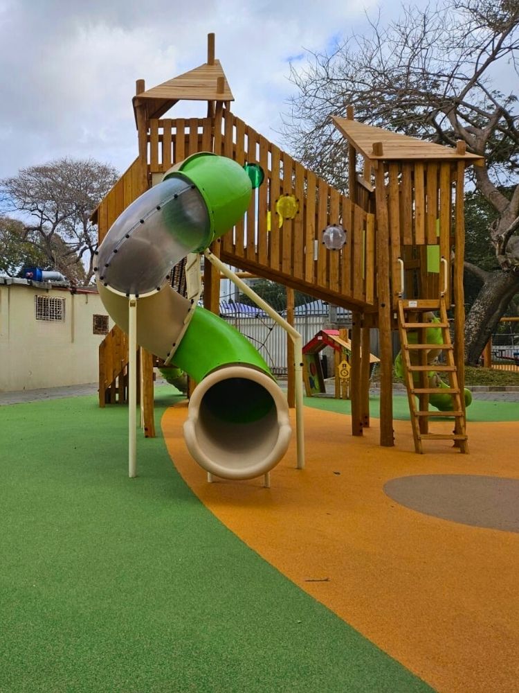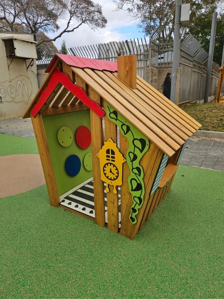 העיצוב משלב עץ רוביניה בגימור טבעי עם פרטים צבעוניים שמוסיפים שמחה. הרשת התלויה כמו רשת עכביש יוצרת רגע של הרפתקה, המגלשות מוסיפות תנועה, והבית הקטן תומך במשחק דמיון רגוע. זה גן שמרגיש שכונתי, נעים, ומדויק לשגרה של תל אביב.